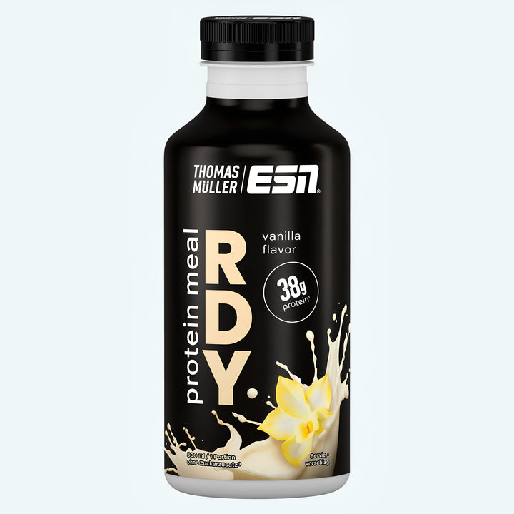 Mehr als satt. RDY. Mach dich bereit für eine neue Liga der Trinkmahlzeiten: RDY Protein Meal von Fußball-Weltmeister Thomas Müller und ESN. Eine ausgewogene Mahlzeit zum Trinken mit 38g Protein, Kohlenhydraten, wertvollen Ballaststoffen, hochwertigen MCT-Ölen, 26 Vitaminen und Mineralstoffen – und leckerem Geschmack. Trinkfertig und ideal für jede Zeit und jeden Ort. Get ready.
